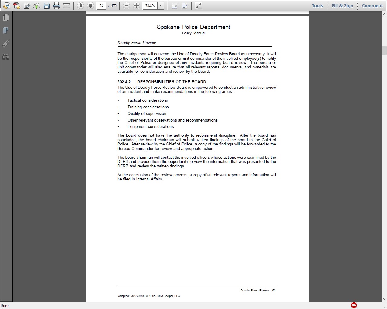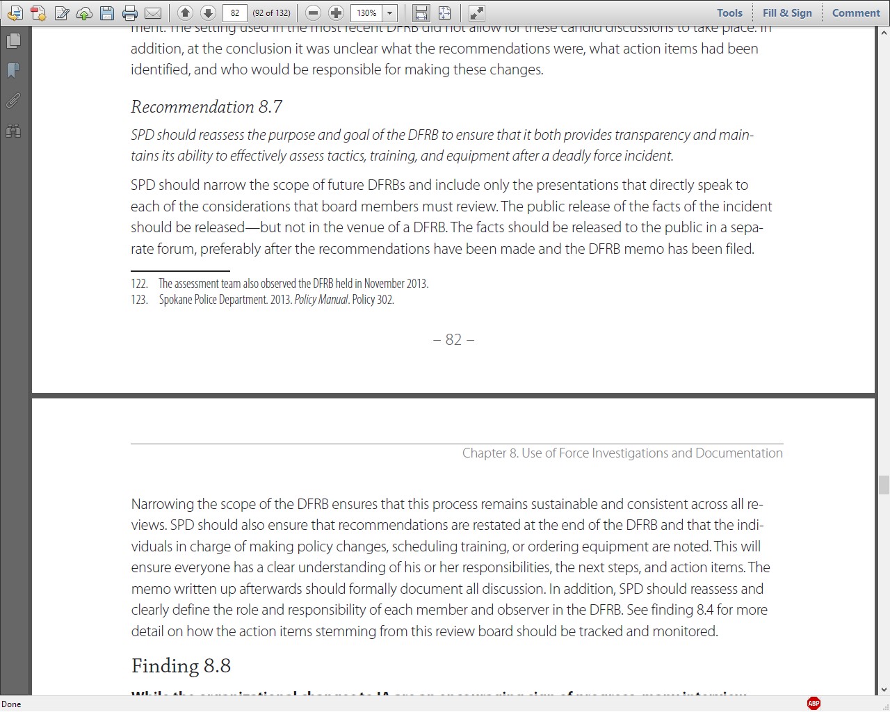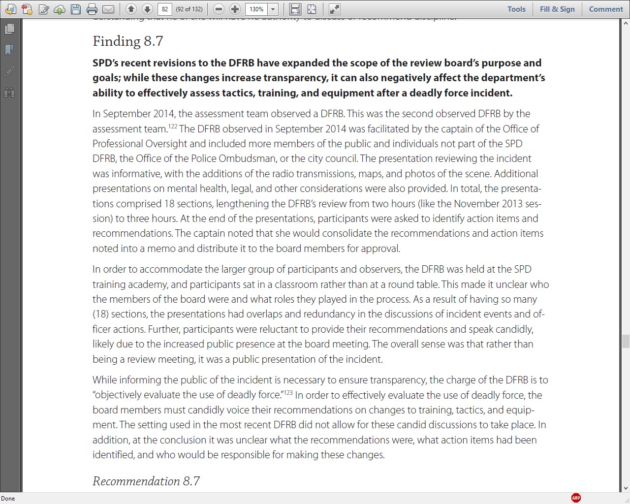 - It is important to note that this wording specifically prohibits OPO participation in “criminal investigations of department employees”. In other words in the case of an Officer Involved Shooting during the criminal investigation phase the OPO is prohibited from participating. This could also become problematic depending upon how SPD deals with COPS/DOJ Recommendation 8.1.