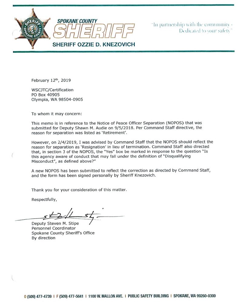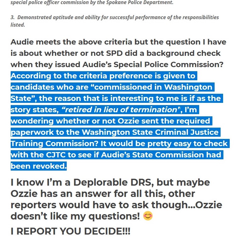 There is no question the local MSM took a big bite out of the arse of Shawn Audie, and School District 81 so people can draw their own conclusions about their coverage. The truth is had Audie not been the Campus Security Office involved in the fracas at Ferris High School (for which he was cleared of wrong doing and no criminal charges have been filed against him) Audie would in all likelihood still be employed by School District 81. The reason that is true is quite simple, Shawn Audie met all the criterion for being a School District 81 Security Officer at the time he was hired including being Peace Officer in good standing with the State of Washington. The reason Audie was in good standing with the State is because the Spokane County Sheriff’s either royally screwed up Audie’s separation from the SCSO or some type of agreement was reached with Sheriff Ozzie Knezovich and Audie that he would retire and fade away into the sunset, something that happens more often than people realize. There is no disputing of the fact that Shawn Audie’s status with the State of Washington was changed only after I brought the issue forward to the Public on February 2, 2019.