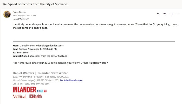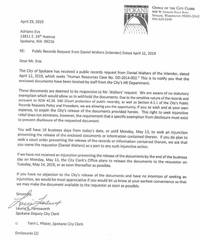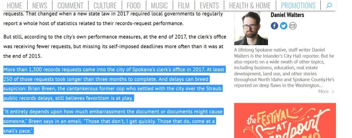 according to the account she gave the city in 2014 and relayed to the Inlander.”