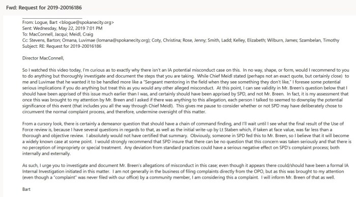 *** Wait just a second Chief Meidl…now you are saying the video “contained evidence of policy violations”? The facts are and the records will show that SPD Use of Force Experts Lt. Boothe, and Sgt. Wheeler after reviewing the video found that there was “policy violations”, but when moved up the Chain to Lt. Staben and Major King the SPD’s expert analysis was overruled as within policy which of course prevented the OPO from knowing about it. Ellerman’s arrest took place February 12, 2019 over three months ago and now you have decided to change the finding because I brought it to the attention of the OPO?