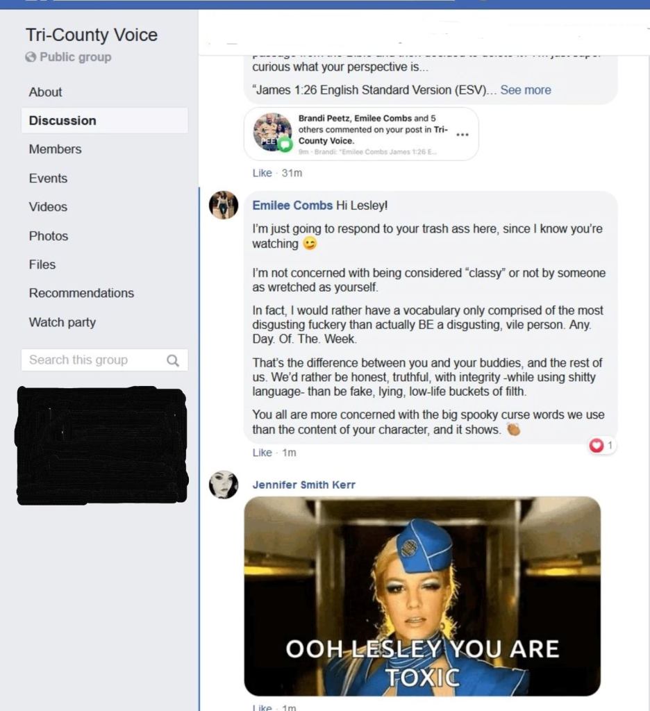 I want to correct a minor mistake Lesley Haskell made in some posts she made while she was attacked by Sharon Dust on the Tri-County Voice Facebook page. Lesley Haskell was understandably under the impression that the fake account was Tanner Rowe’s wife Emilee Combs as both Mr. and Mrs. Rowe interact with Sharon Dust. Emilee Combs is a member of the Spokane Regional Issues and Politics FB group and despite her vitriol is allowed to post in that FB group.