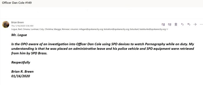 You might ask why Jacquelyn MacConnell the former Phoenix Police Officer who was hired by SPD as the Director of Strategic Initiatives overseeing the Spokane Police Department’s IA Unit and who is supposed to provide a “Civilian Voice” to the IA Process is pictured above, the reason is simple Public Records demonstrate she did all she could to mitigate the Dan Lesser video, and she being a woman should have at least some concern about the conduct of Officer Cole. Since the OPO and the Public now knows what is going on it will be pretty hard to try and mitigate this one and it is her responsibility to make sure this one is properly investigated and proper discipline if that is where the evidence leads is given.