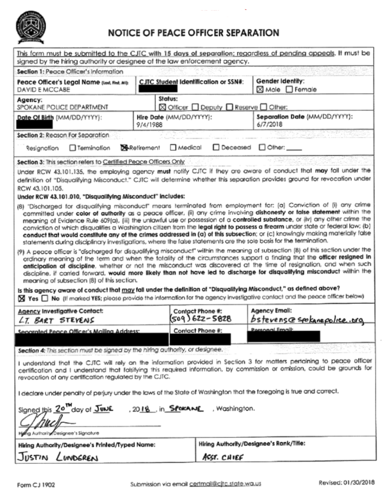 My long battle (well over a year now) with the City of Spokane and SPD to be transparent with the Public about the termination of former SPD Lt. and former President of the SPD Lieutenants and Captains Association, David McCabe who retired in lieu of termination in June of 2018 has resulted in some new twists.