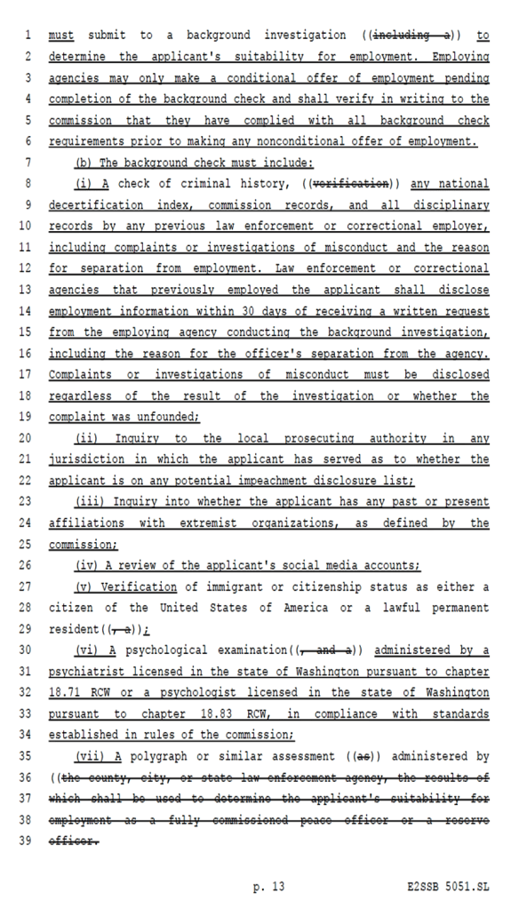 The background check section of the new law was intended to prevent the long-standing practice of withholding derogatory information about a Lateral Transfer from one Washington State Law Enforcement Agency to another just to get rid of the guy/gal.