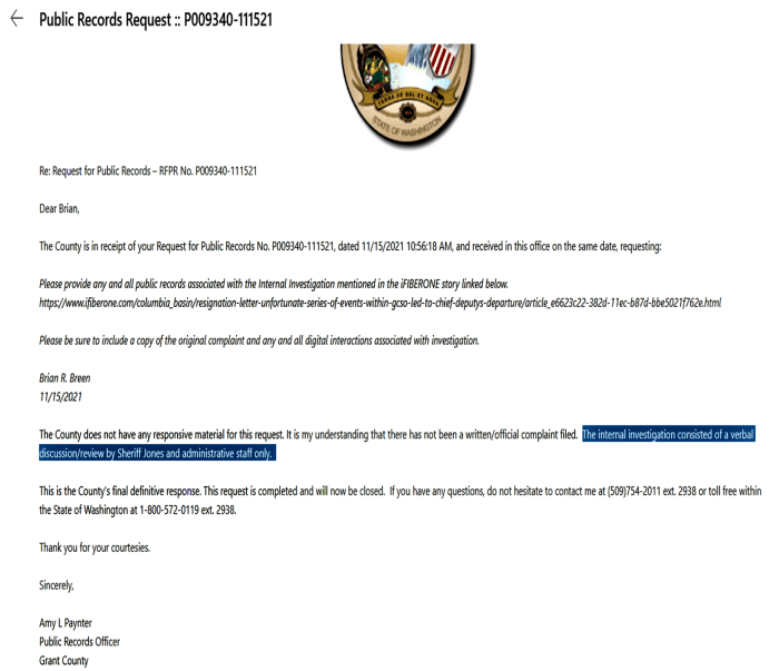 Prior to this story by iFIBERONE, I received information that Grant County Sheriff Tom Jones wanted the payroll fraud allegation kept quiet because the allegation involved several Grant County Sheriff Deputies being paid by a private security company while at the same time being paid by Grant County.